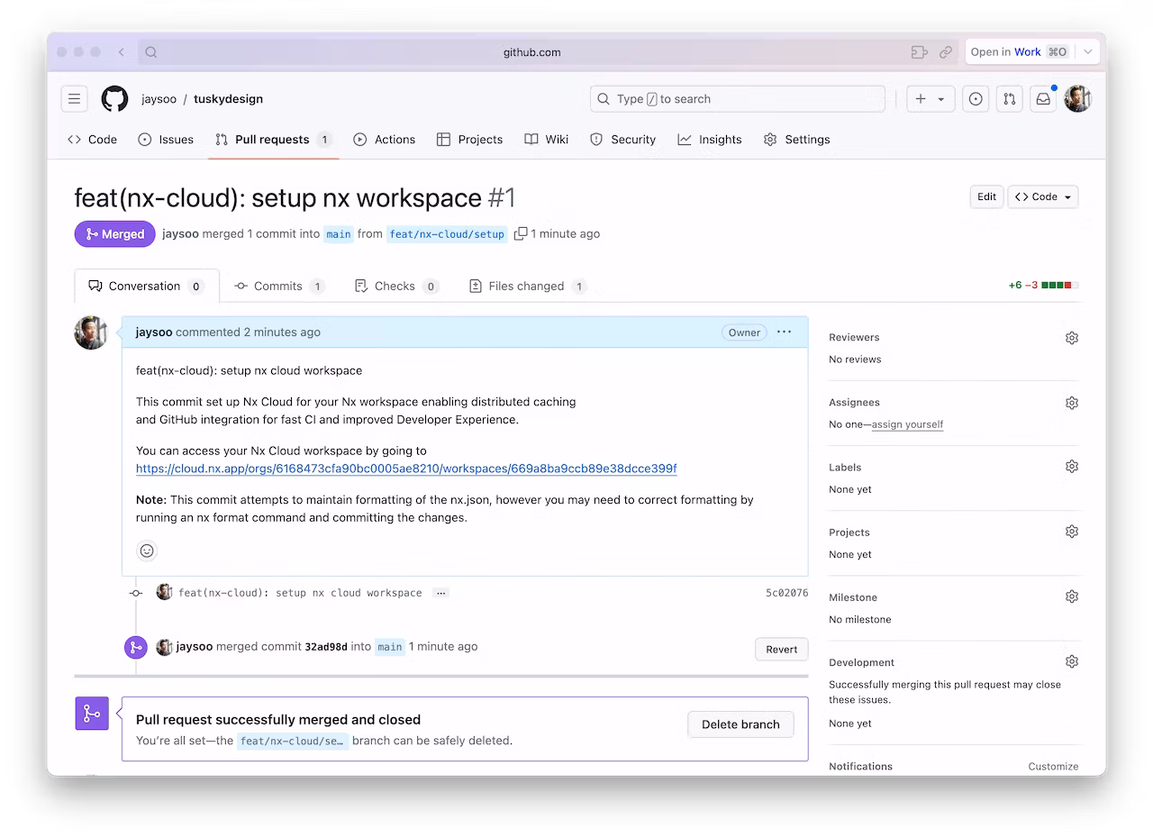 git add .git commit -m 'add CI workflow file'git push origin add-workflowWhen you view the PR on GitHub, you will see a comment from Nx Cloud that reports on the status of the CI run.